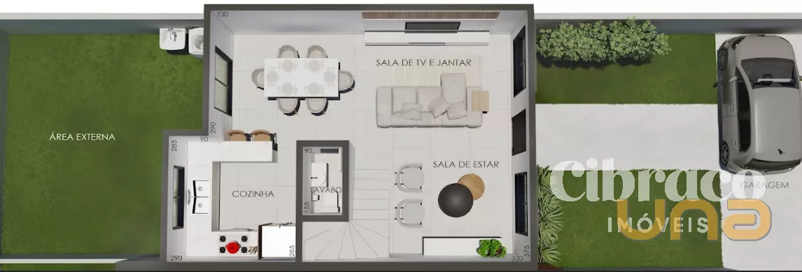 Contendo: Sala de estar, sala de jantar, lavabo, cozinha e área externa com jardim.