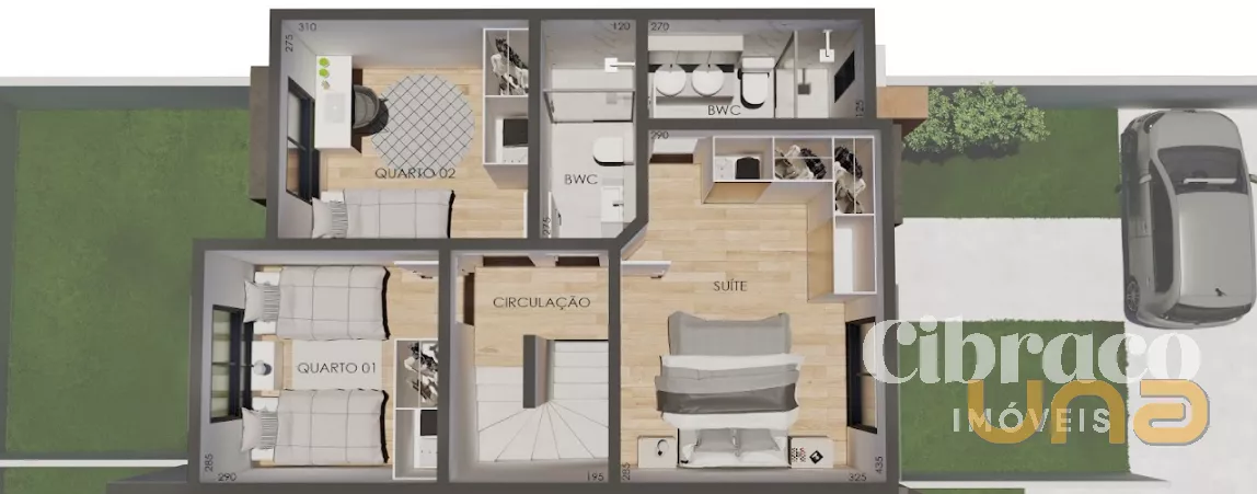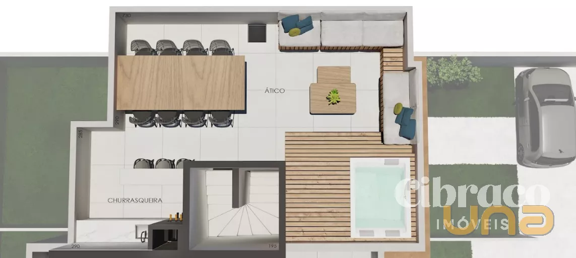 No pavimento superior há 3 quartos sendo 1 suíte, ático com terraço e churrasqueira privativa.