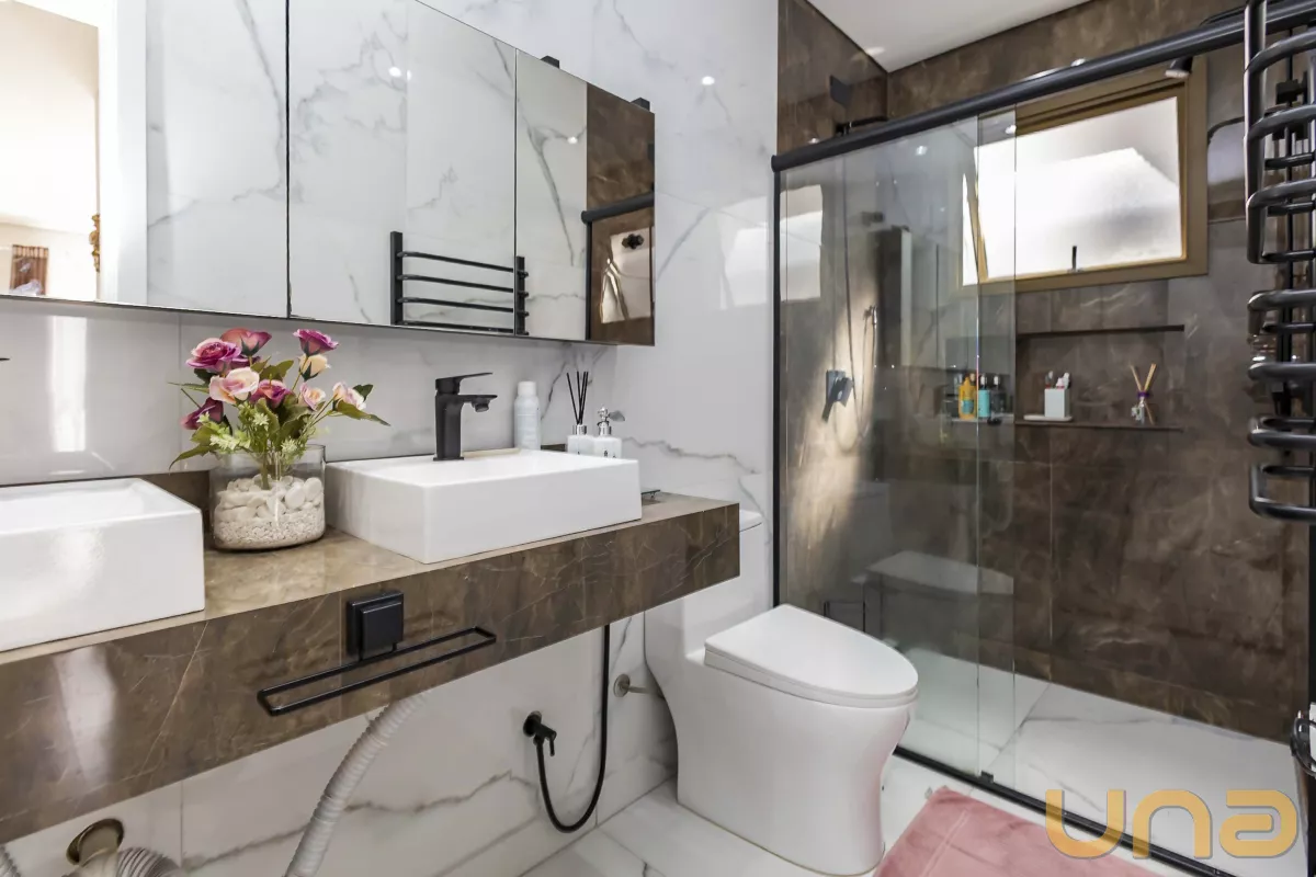 Acabamentos: Piso em porcelanato e laminado, teto rebaixado em gesso com iluminação embutida em led e aquecimento a gás.