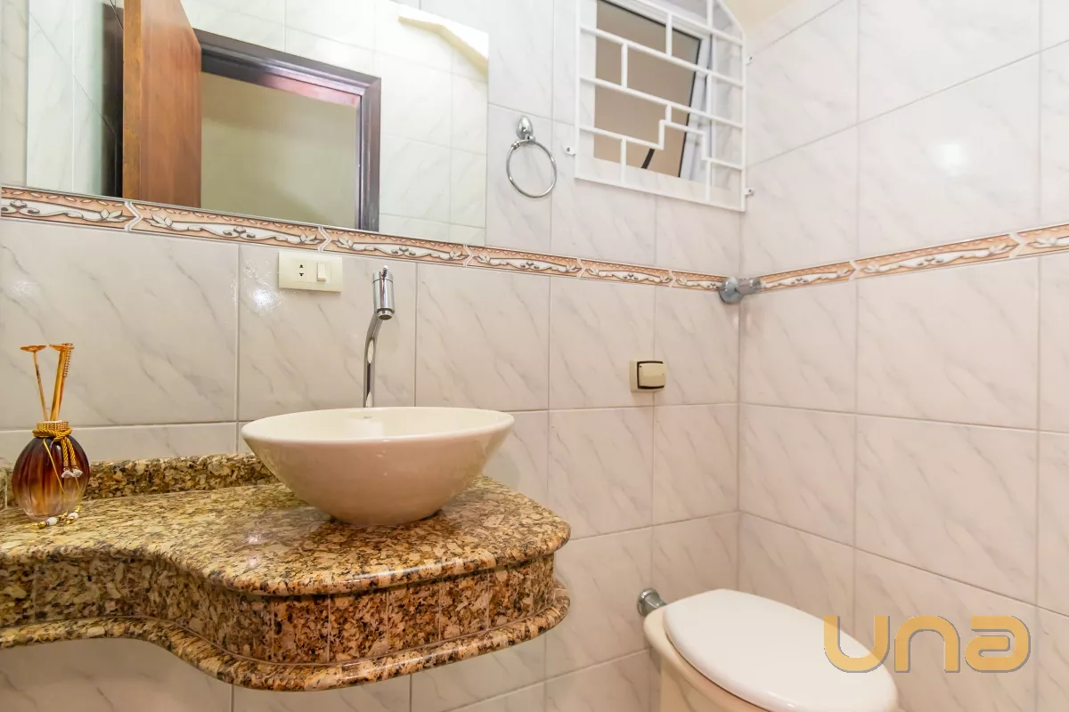 Distribuído em 178,69m², o imóvel é dividido em três pavimentos. No primeiro, você conta com sala de estar e jantar integradas, cozinha com armários planejados, copa, área de serviço e espaço com churrasqueira.