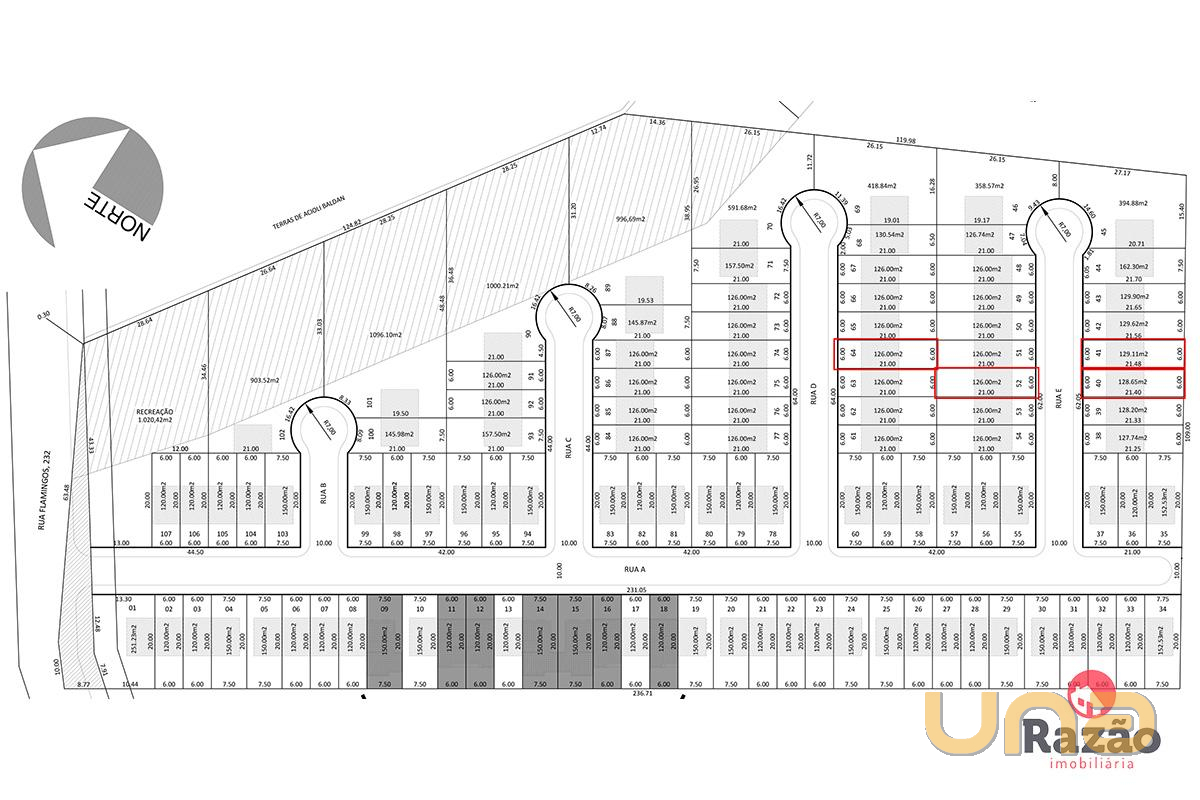 Descrição: Condomínio fechado com 107 unidades, lote 62 com quota de 174,48m², sendo área útil de 6x21x21x6 =126,00m².